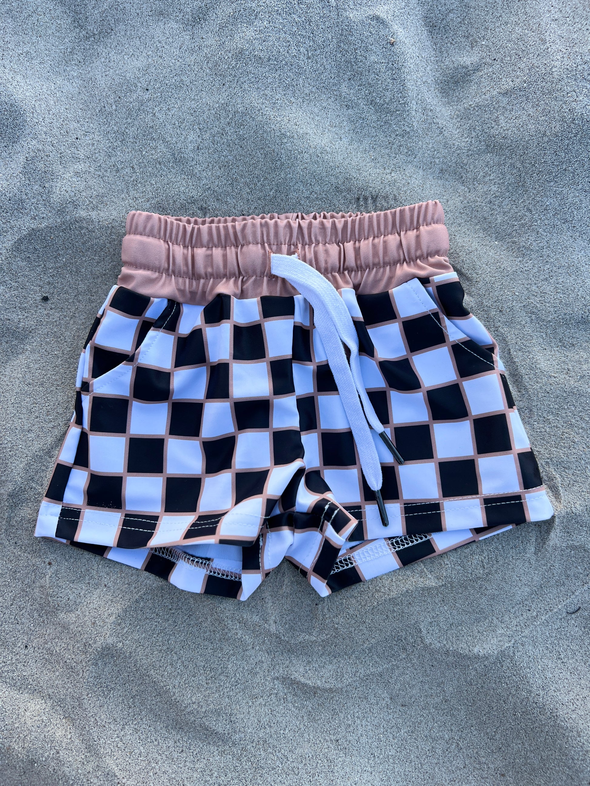 Bring Beachy vibes and all-day comfort to your kid’s summer wardrobe with these Checkered board shorts. Designed with lightweight, quick-dry fabric, they’re perfect for swimming, sandcastle-building, and everything in between. These swim trunks have pockets, an elastic waistband and adjustable drawstring to ensure a secure, flexible fit. 85% nylon 15% spandex